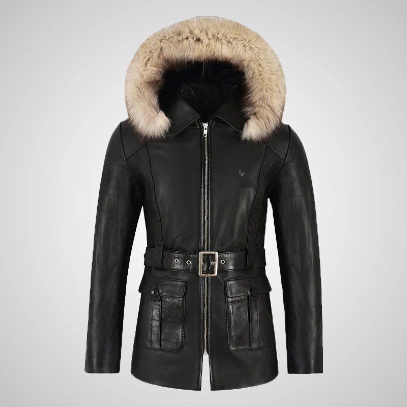 BARBORA Ladies Fur Hooded Leather Parka Jacket Black