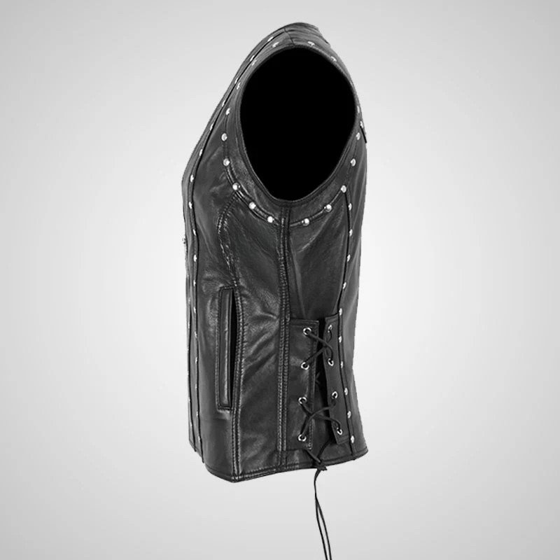GELINE Black Leather Studded Laced Biker Leather Waistcoat for Women