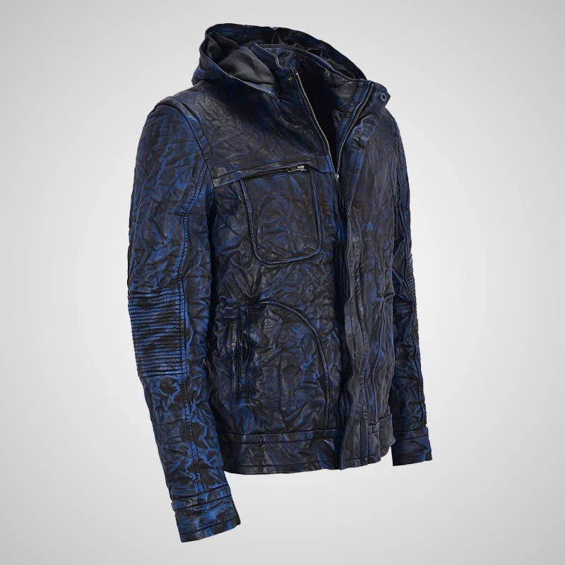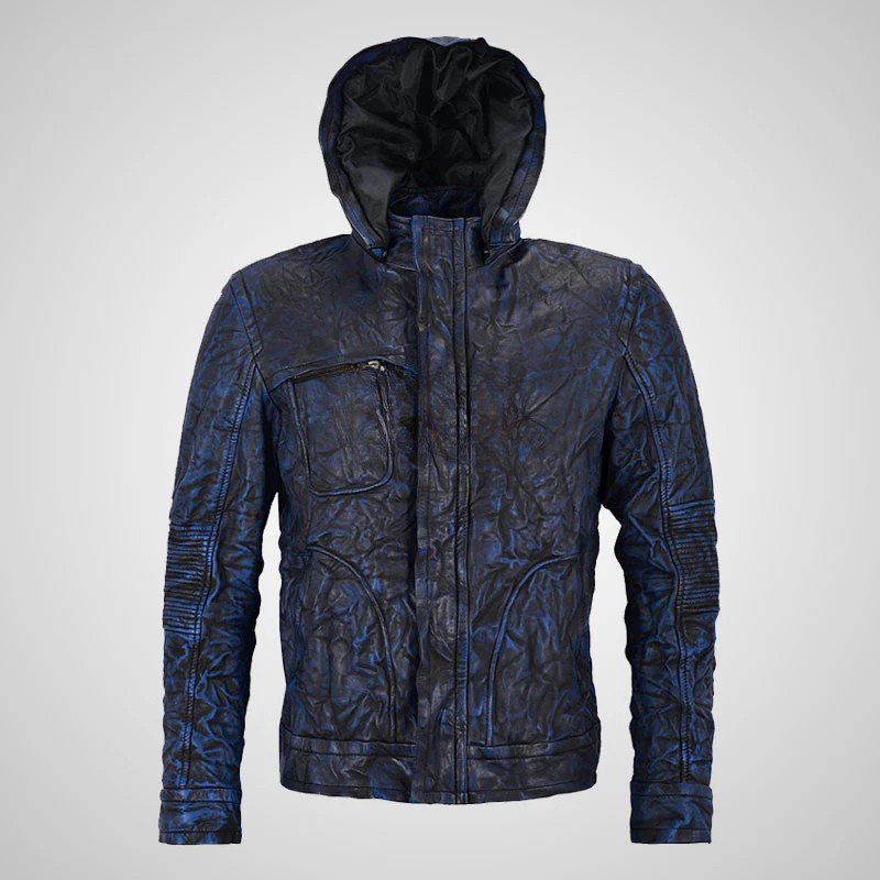 GHOST PROTOCOL Leather Jacket Vintage Blue Wrinkle Hooded Jacket