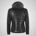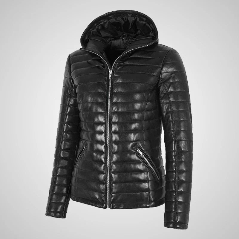 Introducing the Ladies Black Puffer Hooded Leather Jacket, a must-have for winter fashionistas. This jacket is crafted from soft lamb napa leather, providing both style and comfort. The padded design offers warmth and insulation, making it ideal for cold weather. The zip fastening ensures convenience and ease of wear, while the hood adds an extra layer of protection from the elements. With two outer pockets, this jacket combines functionality with fashion. Whether you’re running errands or heading out for a casual outing, this leather puffer jacket is the perfect choice. Stay cozy and stylish with this versatile wardrobe essential.